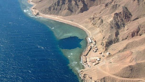 Голубой дырой называют подводный вертикальный провал у побережья Красного моря близ египетского города Дахаб. Глубина практически круглого по форме провала составляет сто тридцать метров. Голубая дыра на глубине пятидесяти метров соединяется с Красным морем 26-метровым тоннелем в стене кораллового рифа, называемым Аркой.