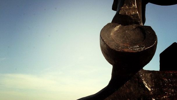 Центральной фигурой памятника является бронзовая скульптура встающего на дыбы коня и сидящего на нём всадника, который олицетворяет русского/советского воина. В правой руке всадник держит высоко поднятый меч, левая, с распростёртой ладонью, вытянута вперёд и вниз. Под брюхом коня — поверженная, искорёженная свастика. Общий вес коня и всадника — 27 тонн, высота — 8 м. Скульптура стоит на массивном метровом постаменте, который, в свою очередь, стоит на гранитной платформе высотой 3 м и площадью 120 м² .