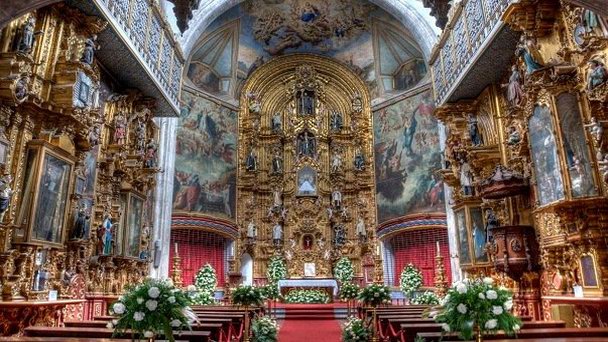 Главным украшением церкви служит украшенный фигурами святых золотой алтарь, который возвышается до самой крыши. Внутри здания находится небольшой атриум, который служит границей между церковью и монастырскими комнатами. Своды церкви украшают фрески с изображениями Девы Пилар.