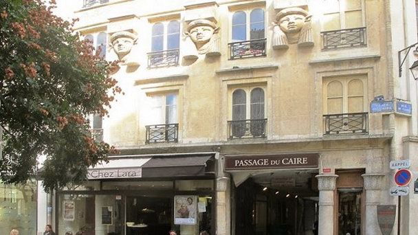 На площади под необычным фасадом в псевдоегипетском стиле с тремя головами богини Хатор (знак завоевания Египта Наполеоном), открывается арочный вход в вереницу галерей, называемых "Пассаж Каира" (Cairo Arcade, Passage du Caire), который имеет 6 входов и включает в себя 3 галереи, общая длина которых 360 метров, а ширина 2,6 метров.