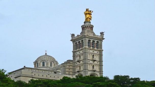 Романо-византийская базилика Нотр-Дам де ла Гард является одной из наиболее выдающихся исторических памятников Марселя и очень популярной у туристов достопримечательностью. Базилика была построена в XIX веке между 1853 и 1864 годах. Этот величественный собор был возведен на средства жителей города на месте старинной часовни, на протяжении нескольких столетий принимавшей паломников и благословлявшей моряков на дальние путешествия. Архитектор древней часовни запомнился в народе только как "Мастер Пьер", а архитектором, создавшим проект нового величественного храма был Анри-Жак Эсперандьё. Особого внимания при осмотре базилики заслуживает статуя Девы Марии высотой 9 метров, венчающая колокольню, а также 8-тонный колокол, высота которого достигает 2,5 метров. Интерьер базилики украшен фресками и цветным мрамором.