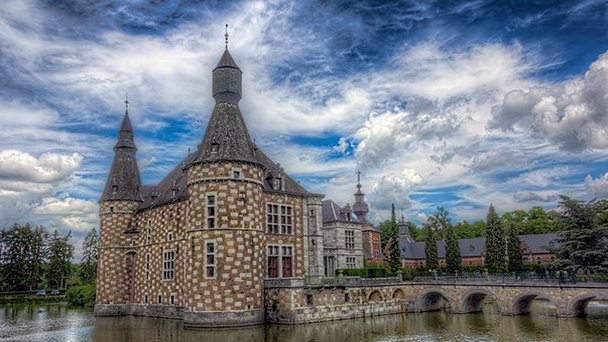 Оригинальный старинный замок в провинции Льеж. Его стены выложены двумя видами камней: белыми и светло-серыми. Это делает строение похожим на шахматную доску.