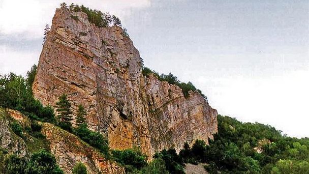 С широкой песчаной отмели открывается удивительный вид на высокий обрыв левого берега, поросший густым сосновым лесом. На фоне скал из воды возвышается трехметровый скальный осколок, упавший сюда в незапамятные времена. Форма этого камня удивительно похожа на половинку тонущего океанского лайнера, каким мы его видим в знаменитом одноименном фильме.