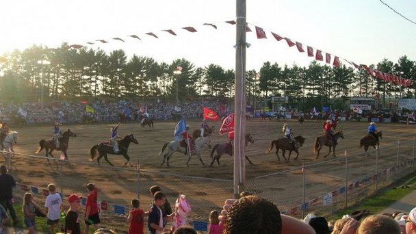 Устраивается родео на быках, лошадях, карусели, много людей, все цивилизованно.