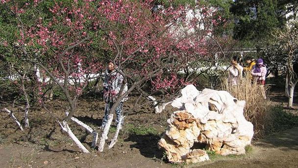 Кроме сливы в парке растут разные виды деревьев - сосна, бамбук, камфара - и другие вечнозеленые растения.