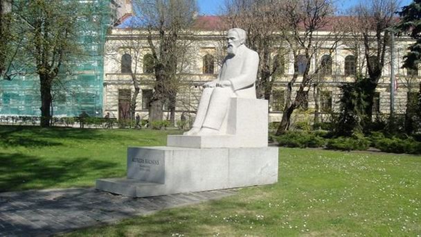 Альфред Калниньш (1879-1951) был известным латышским композитором, педагогом, органистом, музыкальным критиком и дирижером, а также основателем Латвийской национальной оперы. Ко дню 100-летнего юбилея смерти Альфреда Калниньша, 23 августа 1979 года, состоялось торжественное открытие его памятника, проект которого создали архитекторы Илгвар Батрагс и Георг Бауманис по эскизам скульптора Теодора Залькална.
