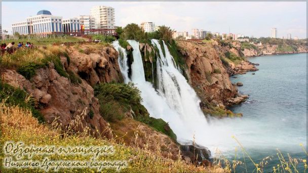 Обзорная площадка Нижнего Дюденского водопада (другое название Карпузкалдыран (тур. Karpuzkald ran)) — в восточной части Антальи. Вода падает с высоты 40 метров прямо в Средиземное море.