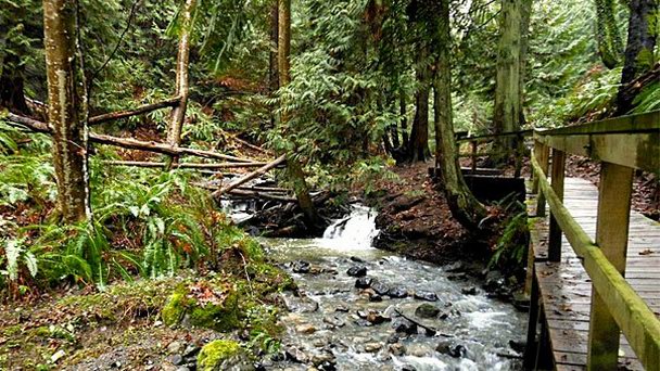 Парк Бич Эстейтс – это длинный участок леса в глубине города. Тропа спускается вниз к проливу Джорджии и галечному пляжу. Дорога проложена по первобытному лесу, однако на крутых спусках и отвесных склонах построены лестницы, облегчающие путь, и деревянные заграждения, предотвращающие сход грунта и обрушение скальных массивов.