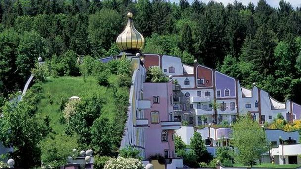 SPA-отель Rogner Bad Blumau является не только отличным местом для отдыха и оздоровления, но и настоящим архитектурным шедевром. Он поражает своим внешним видом, и подходом к постройке различных зданий. Архитектура отеля была спроектирована под влиянием полотен австрийского художника Фриденсрайх Хундертвассер, здесь сделано все, чтобы жить в гармонии с природой. Когда вы входите на территории Rogner Bad Blumau, вся повседневная жизнь остается снаружи. Территорию отеля окружает невысокая стена в 2 слоя, между которыми засыпана земля. Большинство корпусов имеют всего 2 или 3 этажа, их крыши покрыты дерном с газонной травой.