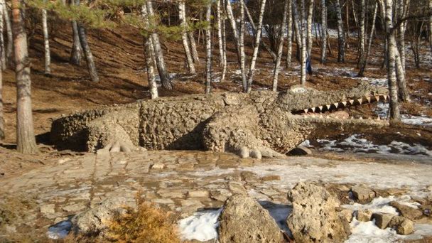 Это четырехметровая каменная скульптура больше напоминает доисторическое животное Deinosuchus hetcheri. Крокодил изображен с открытой пастью, из которой видны острые железные белые зубы.