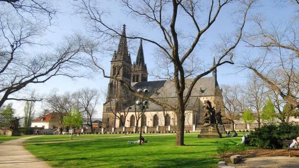 Базилика Святых Петра и Павла располагается в королевской крепости Вышеграде на правом берегу реки Влтава в Праге. Храм был построен при короле Вратиславе I в начале XI века и представлял собой романскую базилику. Храм был частично разрушен гуситами, его не раз перестраивали и меняли облик здания. Сначала ему добавили черты готики, в XVI веке его реконструировали в стиле Ренессанс, а позже – в стиле барокко. В 1902 году была произведена последняя реконструкция храма. Ему были добавлены две новые пристройки – великолепные башни, возвышающиеся над Вышеградом, названные Адамом и Евой, что придало зданию новый неоготический вид.