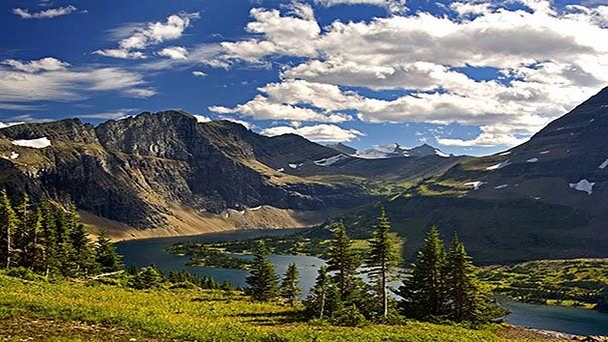 Национальный парк Глейшер признан индейцами как священный край. Его иногда называют Маленькой Швейцарией или Американскими Альпами. Главный туристический маршрут на двухъярусном автобусе называется Дорога к солнцу и 80 км тянется с нижней части парка до Континентального перевала, постепенно поднимаясь на высоту 2000 метров. По дороге вам встретятся водопады, чистейшие озера, напоминающие скандинавские фьорды и вечнозеленые непроходимые леса.