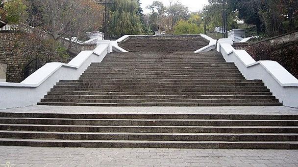 Длинную пологую лестницу в ее нижней части окружают солидные здания, а выше по склону по обе стороны украшают благородные ели и красивые фонари. Газоны по соседству нередко декорируют рукотворными оригинальными клумбами. Венчает лестницу памятник Ленину.