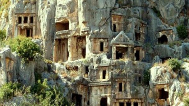 Скальный некрополь Миры – достопримечательность турецкого города Демре, который раньше назывался Мира. Город находится на территории Анатолии – древнем государстве Ликии. Некрополь представляет собой ликийские гробницы. Ликийцы верили, что душа должна быть ближе к богу, поэтому умерших хоронили как можно выше.