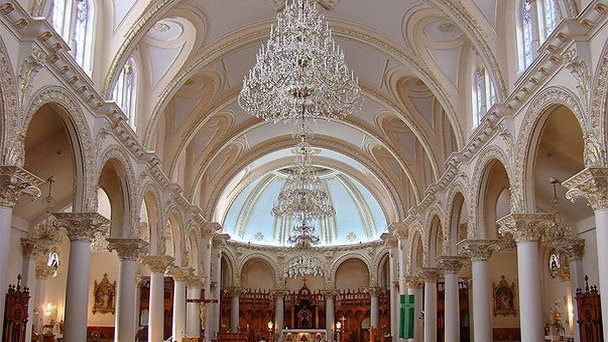 Внутри своды поддерживаются 14 белыми мраморными колоннами, оформленными позолотой и вставками розового мрамора. Потолок украшен тремя хрустальными многоярусными люстрами. Витражи в соборе святого Гиацинта появились только в 1998 году. В результате их установки белоснежный храм наполнился радужными бликами и мягким светом. Орган модели Casavant Opus находится в соборе с самого момента его открытия, но долгое время не использовался. После последней реконструкции в 1998 году его снова стали использовать во время проведения воскресной службы и литургии.