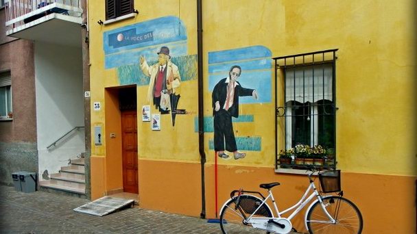 Неподалеку от моста Теберия - улица Мареккья, где фасады некоторых домов расписаны картинками по мотивам фильмов Феллини (и не только).Если сразу за этим мостом свернуть на узенькую улочку Via Marecchia, то можно получить истинное эстетическое удовольствие.