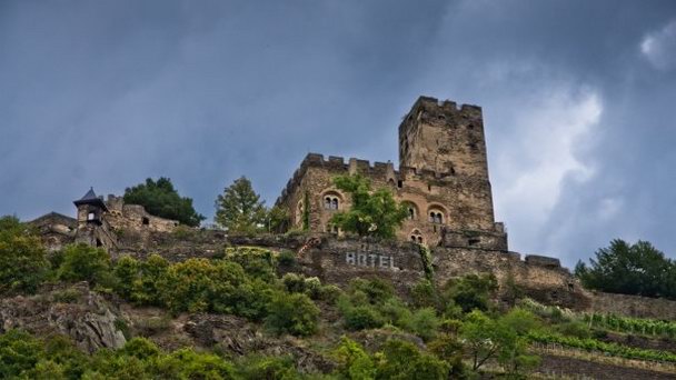 Замок Гутенфельс расположен на выступе горы над городом Кауб (Kaub), расположенным на берегу Рейна.