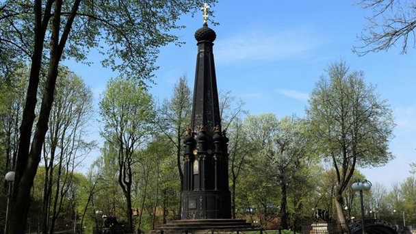 Памятник был отлит из чугуна в Санкт-Петербурге и весит около 30 тонн. Высота монумента составляет около 26 метров. Любопытная история связана с установкой памятника. В 1856 году, во время работ по закладке фундамента будущего здания мужской гимназии, землекопами были найдены две французские пушки. В 1873 году эти пушки были установлены по обеим сторонам памятника на специально отлитых лафетах.