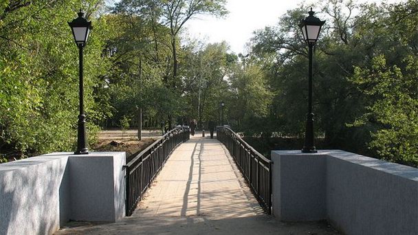 Конструкция пешеходного моста Пассионарии металлическая, настил - деревянный. Его нагрузка не рассчитана на проезд автотранспорта, потому перед въездом установлена вертикальная тумба.