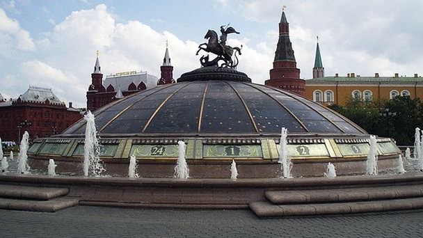 Фонтан «Часы мира» представляет собой главный купол подземных торговых рядов «Охотный ряд». Это часы с уникальным циферблатом, на котором указаны названия городов. Стеклянный купол медленно вращается и делает полный оборот за сутки. По часам можно узнать время в крупных городах мира с точностью до пяти минут, отсюда и название фонтана.