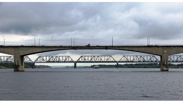 Октябрьский мост, автомобильно-пешеходный, построен в 1961-1966 годах по проекту Е.С. Уланова, брата балерины Г. Улановой. Длина моста 800 м., ширина 18 м., высота над водой 26 м. Соединяет центр Ярославля с Заволжским районом города, Москву - с Вологдой и Архангельском.