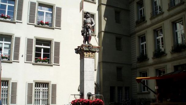 Бравый воин, венчающий фонтан перед старой ратушей, изображает знаменосца в боевых доспехах. В руках он держит стяг с изображением герба Берна. Люди на должности знаменосца в средневековой Швейцарии были ответственны за поддержание порядка в отдельной части города, а в военное время должны были формировать из жителей этой части города войско и вести его в бой. Ногу знаменосца обхватил симпатяга-медвежонок, символ Берна. Вероятно, это можно трактовать и как большую привязанность города к своему фонтану.