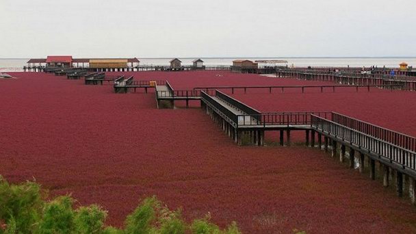 Одним из наиболее популярных пляжей в Китае является Красный пляж Паньцзинь, расположенный в 25 километрах к юго-западу от города Паньцзинь в дельте реки Ляохэ. Свое название он получил благодаря внешнему виду, который ему придает множество произрастающих здесь морских водорослей. Сорняки начинают появляться в апреле и мае, в течение всего лета они остаются зелеными. Осенью цвет водорослей меняется, становясь ярко красным, а пляж приобретает чудесный вид, будто он полностью покрыт красной ковровой дорожкой. Большая часть пляжа - природный заповедник, эта зона закрыта для общественности и лишь небольшой ее кусок доступен туристам. Для перемещения по заповедной зоне в 1975 году был построен пешеходный мост, с которого открывается сказочная панорама на Красный пляж Паньцзинь.
