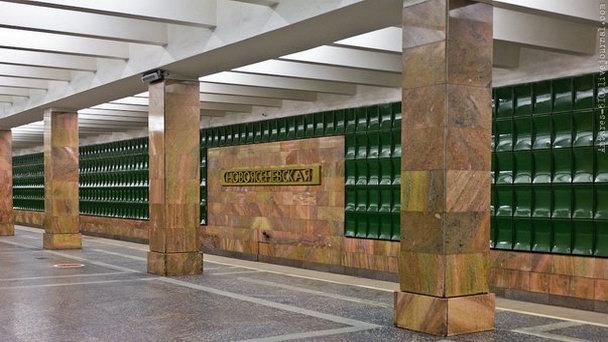 Станция выдержана в спокойных, размеренных темных тонах, в оформлении преобладают четкие геометрические формы. Прямоугольные колонны облицованы темно-розовым мрамором, стены - темно-зеленой ячеистой плиткой, пол - серым гранитом.