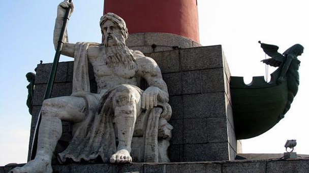 У подножия Ростральных колонн восседают величественные скульптуры, созданные в начале XIX века, одновременно со всем архитектурным ансамблем Биржевой площади. Четыре аллегорических статуи из пудожского камня (известковая порода, добываемая Ленинградской области) символизируют четыре великие реки: Волхов, Неву, Волгу и Днепр. Скульптуры были выполнены по моделям французских скульпторов И. Камберлена и Ж. Тибо.