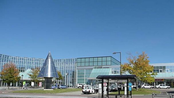 Фасад станции выполнен из алюминиевых конструкций и стекла, а непосредственно на площадке перед входом в помещение расположена парковка, несколько торговых центров и зеленые насаждения.