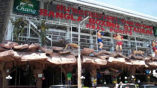 Боксёрский стадион в Патонге – это самый большой стадион для тайского бокса в южном Таиланде. Стадион представляет собой большое современное здание прямоугольной формы. Здание имеет оригинальное оформление. Первый этаж напоминает пещеру с нагромождением камней и колонн. Под этим нагромождением скрывается бар. Сверху на камнях, а, точнее, на их имитации, установлено шесть скульптур бойцов муай тай и скульптуры льва и тигра, вероятно, символизирующих ярость и бескомпромиссность боксёрских поединков.