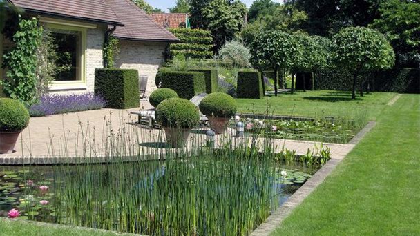 На севере расположена комната с мужской линией - строгая и четкая. А вот на западе - женская линия - изящная, не имеющая прямых линий. По периметру посаженый бук принимает очертания храма. Этот уголок хозяйка называет центром медитации. Юг - субтропические растения, дарящие ощущение средиземноморской страны. Весь ландшафт дополнен небольшим прудом с парой лежаков. А вот в восточной части расположился огород с пряными травами.