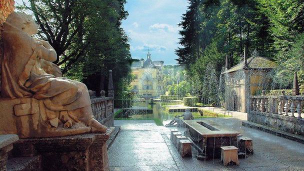 Дворцовый комплекс раскинулся у подножия Хельбруннской горы, которую природа наделила огромным количеством водоносных источников. Поэтому жизнь здесь буквально кипит, а в тени кустов и деревьев то тут, то там внезапно в небо вздымаются струи воды. Причудливые фонтанчики расположены порой в самых неожиданных местах, разбрасывая живительную влагу прямо на гостей дворца. Архитекторы и инженеры кропотливо трудились над созданием этой неповторимой атмосферы. Им удалось создать удивительный мир отдыха и развлечений - игра тени и света, эффект неожиданности - необычности этому месту занимать не приходится.