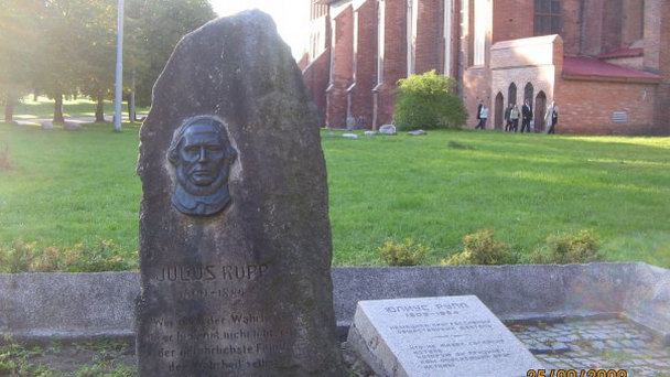 Мятежный кёнигсбергский проповедник Юлиус Рупп. В 1844 г. с церковной кафедры он произнёс слова отречения от церкви и организовал в Кенигсберге первую свободную евангелическую общину "Друзья света". Бронзовый рельеф Руппа был создан его внучкой, знаменитой художницей Кётэ Кольвиц, жившей неподалеку на Линден-штрассе (сегодня — ул. Октябрьская). Сейчас на памятнике — копия оригинала, которая была доставлена, в город внучкой художницы Юттой Бонке-Кольвиц и установлена 22 июня 1991 года.