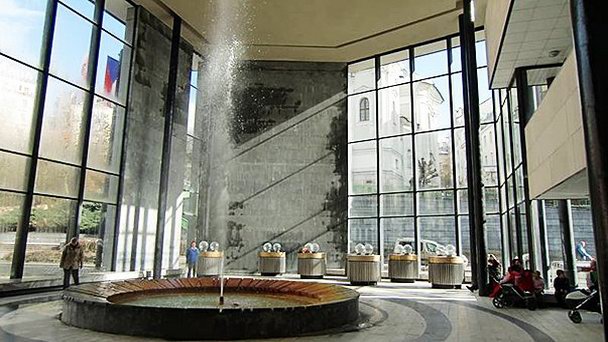 В прогулочном зале колоннады находится фонтанирующий источник, а также 5 его ответвлений, подающих одну и ту же воду разной температуры – именно от температуры воды зависит ее действие на организм.