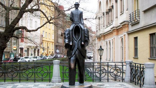 Бронзовая скульптура, изготовленная по проекту Ярослава Роны, появилась в Праге в 2003 году. Памятник Кафке составляет 3,75 метров в высоту, а весит он 700 килограмм. Памятник изображает писателя на плечах у гигантского костюма, в котором отсутствует тот, кто его должен носить. Памятник отсылает к одному из произведений Кафки "История одной борьбы". Это история о человеке, который верхом на плечах другого человека бродит по улицам Праги.