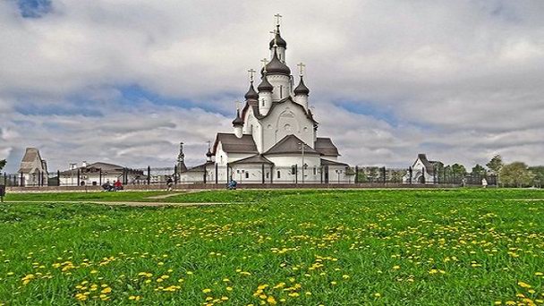 Парк разделён на две части Искровским проспектом, в одной из частей возведён храм св. Первоверховного апостола Петра. Пятиглавая церковь выполнена в классическом русском стиле, а примыкающая к ней шестидесятиметровая колокольня является самым высоким культовым зданием среди возведённых в настоящее время в Санкт-Петербурге. Благодаря расположению парка храм виден с любой стороны на большом расстоянии.