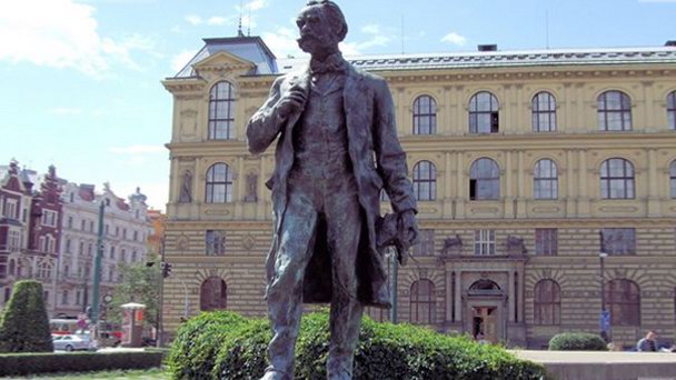 Памятник Антонину Дворжаку был установлен на площади Яна Палаха перед знаменитым Рудольфиниумом, дворцом музыки и искусств.