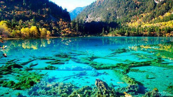 На востоке Китая в провинции Сычуань расположен национальный парк Цзючжайгоу. Его название переводится как «долина девяти деревень». Этот парк славится тем, что в нем больше сотни озер и вода в них кристально чистого зеленого, голубого и бирюзового цветов, так как все эти озера образовались в результате таяния ледников. В 1992 году парк был включен во всемирное наследие "ЮНЕСКО", а с 1997 года объявлен биосферным заповедником.