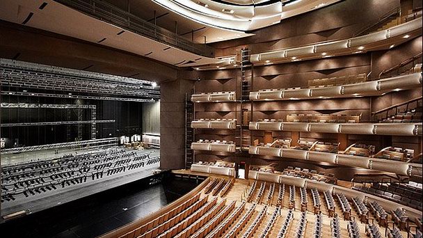 Интерьер главного зала выполнен в традиционном европейском стиле - он имеет подковообразную форму, четыре ряда небольших балконов, выпуклый потолок. Зал оснащен самыми современными средствами звукоизоляции, позволяющими создать абсолютный акустический эффект. Вместимость окрестровой ямы составляет 110 музыкантов, поэтому репертуар имеет определенные ограничения - не всякий оркестр сможет комфортно работать в таком пространстве. Если говорить об архитектуре здания, в целом, то многообразие использованных материалов позволило создать поистине многогранное произведение архитектуры, гармонично вписанное в городской ландшафт.