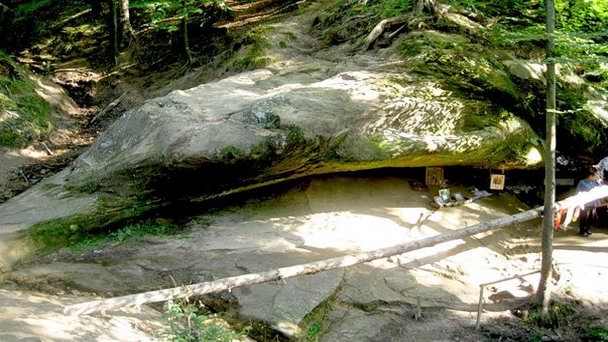 Блаженный камень – удивительное природное творение, огромная десятиметровая глыба, козырьком выступающая из горного склона. Естественный грот под блаженным камнем, врезающийся в гору почти на два метра, дал приют странствующим монахам. Молитвами и водой, пробивающейся из-под камня, исцеляли они страждущих и болезных. Так был основан первый пещерный Манявский скит.