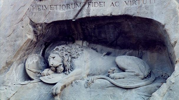 Карл Пфюффер, счастливо избежавший гибели по причине отпуска, был глубоко потрясен печальной судьбой своих товарищей и решил увековечить память погибших солдат. В 1918 году начался сбор средств на создание памятника (свой вклад внесла даже российская царская семья). Барельеф, высеченный в скале, изображает умирающего льва, прикрывающего своим телом щит с гербами Швейцарии и Франции.