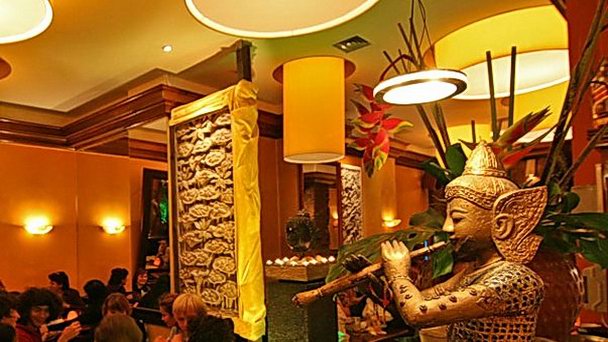 В Amrit замечательный дизайн интерьера в индийском стиле. Все оформлено как сад, где в центре расположена сидящая фигура Будды, а вокруг - деревья и красные стены из дерева.