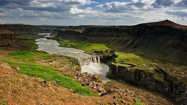Hafragilsfoss - это один из крупнейших водопадов в горной ледяной реке Jö kuls Fjö llum. Водопад обрушивается с огромным грохотом с высоты 27 метров (89 футов) и имеет ширину около 90 метров (300 футов).
