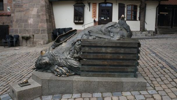 Необычная скульптура зайца находится в городе Нюрнберге напротив дома-музея Альбрехта Дюрера. Автором чугунного зайца стал скульптор Юрген Герц. Скульптура была установлена в 2003 году. Как известно, Дюрером была создана акварель "Молодой полевой заяц", о которой и напоминает скульптура перед музеем. Это произведение Дюрера одно из любимых у жителей Нюрнберга, в старые времена картина встречалась практически в каждом доме города.